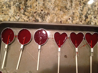 My suckers were easy to do in the other room, out of the way of the others in the kitchen. I boiled the mixture, put it in a candy storage container to pour it into the sucker molds I had laid out on a cookie sheet...on the doilies. Well, of course, boiling candy does not do well in plastic. The bottom melted through and in my genius glory, I put my hand out to catch the candy to prevent a mess. If I had just let it go, it would have just spilled onto the cookie sheet...mess free.